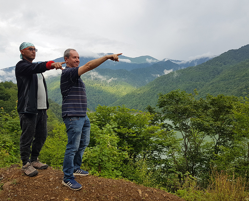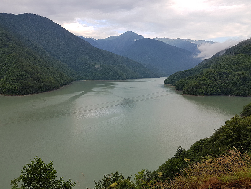 Дорога вначале шла по равнине, но вскоре мы выехали к огромному водохранилищу Джвари Енгри и стали понемногу забираться вверх, к перевалу. Супротив моих опасений, дорога на горном серпантине была весьма приличная, и водитель ехал аккуратно.