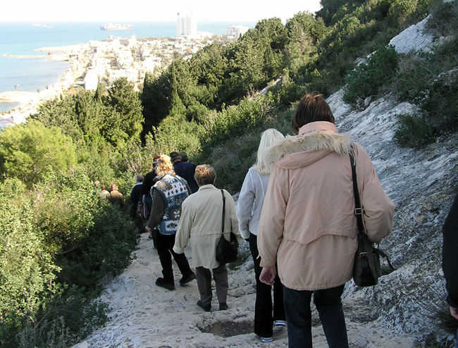 начали спускаться по склону к пещере пророка Ильи. Весь овраг ниже монастыря принадлежит ему же, что гарантирует сохранение незастроенного вида на море. В былые времена монахи использовали эту землю для подсобного хозяйства - огороды, пастбище. Внизу оврага находилась мельница, которая в 60-х годах прошлого века была превращена в часовню "Святого Семейства" (Sagrada Familia :). За мельницей тропа повернула вправо и мы начали спускаться по ступеням вырубленным Элияхув 19-м веке. Окружающий пейзаж резко поменялся - кустарники почти не встречались, зато тропинка шла по каменному склону. Раньше здесь