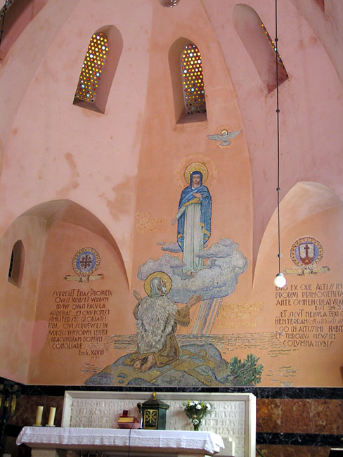 Выйдя из парка мы продолжили подниматься до монастыря кармелиток. Немного подождав, пока нам откроют двери, мы вошли внутрь. Монастырь был основан в 1452 г. в месте, которое сейчас находится на территории больницы Рамбам. Однако с развитием Хайфы, этот район стал слишком шумным, соседство с веселыми моряками не приводило настоятельницу монастыря в восторг, и в 30-х годах она наконец получила разрешение построить новое здание на склонах горы Кармель, в то время бывшем довольно безлюдным местом. Монастырь открылся в 1936 г. Меня позабавила роспись над алтарем - пророк Илья стоит на коленях перед девой Марией, ну