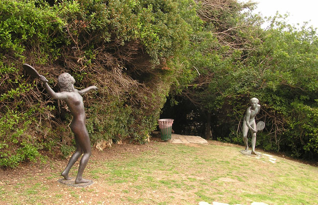 Вначале мы зашли в парк скульптур. Все работы в этом парке авторские копии Урсулы Малбин, немецкой еврейки, успевшей уехать в Швейцарию. В молодости она была в сионистском кружке, но приехала в Израиль только в 1967. В конце 70-х годов прошлого века она решила подарить одному из 3-х крупных городов свои скульптуры, с условием что они будут выставлены в парке. Она послала письма в мэрии Иерусалима, Тель Авива и Хайфы. Теди Колек сразу отверг ее предложение (".. не сотвори себе кумира.."), Тель Авив вообще не отреагировал (а зря, уродливые композиции город совсем не украшают), а вот Хайфа с радостью приняла подарок, но.. попросила надеть на мужские скульптуры трусы :). Очень уютный парк, с видом на залив, хорошо тем кто живет рядом.