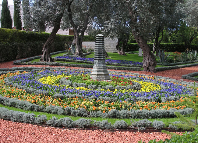 Экскурсию на верхних терассах проводил Роман, экскурсовод от Бахайцев. У него несколько раз спрашивали что означает та или иная деталь ландшафта, на что получали ответ - исключительно эстетический смысл. Символики у Бахаев почти нет, в основном все крутится вокруг цифры 9, которое они считают священным и числа 19 . Сады расположенны на 19 террасах - 18 учеников и сам Баб, похороненный на средней террасе. В году 19 месяцев, в каждом месяце 19 дней. Оставшиеся 4(5) дней перед новым годом (21 марта), бахайцы посвящают делам общины.Сады разбиты таким образом чтобы уменьшить количество оттенных участков, и вообще, яркому освещению придается большое значение, ночью сады подсвечиваются как фонарями сверху, так и спотами снизу. Сделано это было не только в силу эстетических причин, но также и потому что когда Бахаулла сидел в тюрьме, первые полтора года он провел почти в кромешной темноте - ему выдали всего одну свечу..