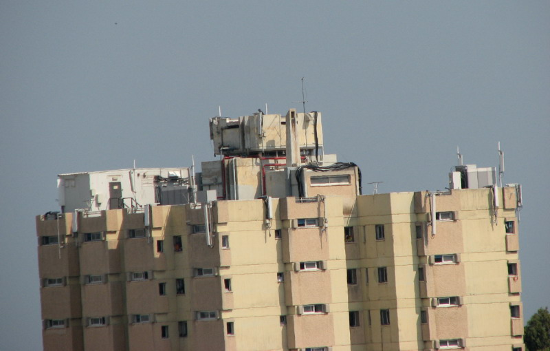 В парке, [info]Авнер (благодаря которому мы узнали об этом проекте) обратил мое внимание на многоэтажный дом, стоящий по другую сторону от вади. На его крыше стоят 24 передаточные антенны сотовых компаний + генератор.