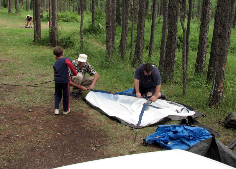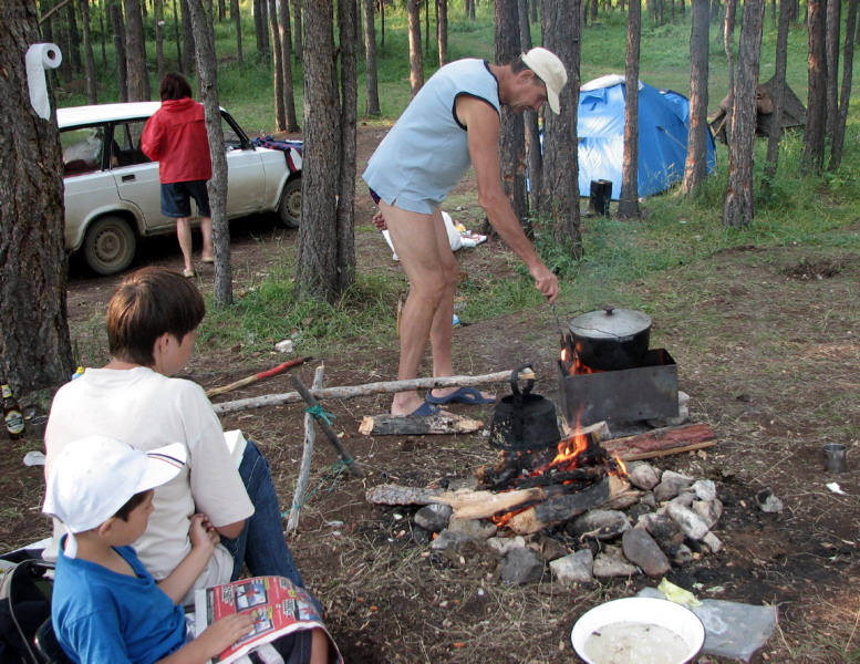 Проехав километра 3 вдоль Байкала, мы остановились на ночевку. Несмотря на огромные пространства, вокруг нас уже стояло довольно много палаток. Популярность этой поляны объяснилась довольно быстро - пологий спуск к берегу (в большинстве мест Байкал окружен обрывистыми берегами), да и проехать на машине можно было еще километра 3 не больше.