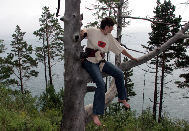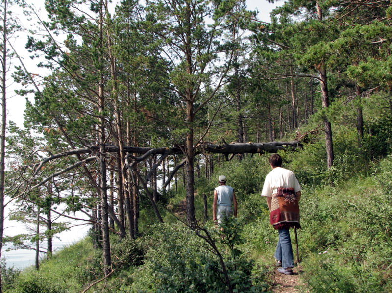 Утром Лена и Йонька остались на хозяйстве, а мы с Валерой и Оксаной отправились к роднику, на этот раз поверху, а не по пляжу. Что сказать, вне зависимости от цели похода, прогулка по лесу на крутом склоне была замечательной. Цветы, бабочки, поваленные деревья. [Кстати о бабочках. Бабочки на Байкале красивые, разноцветные, и, как выразился Игорь, "совсем дикие", то есть непуганные. В лесу одна такая бабочка села Игорю прямо на руку. А вообще, мы за всю поездку столько их нафотографировали!] Невидимые доселе лагуны Байкала. После полутора часов тропинка пошла вниз и мы вышли к источнику. Родник вытекает прямо из горы, кто-то заботливый вбил полуцилиндр, чтобы легче было пить. Пили, пили наконец то напились :). Обратно пошли по пляжу, прошли мимо нудистской парочки.
