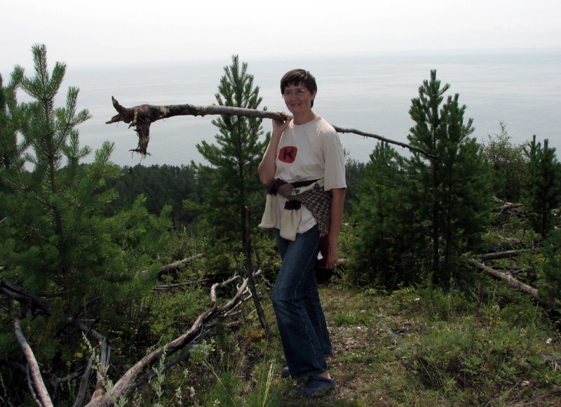 Разбили 2 палатки, разожгли костер из валяющихся веток. Но дерева было явно мало, поэтому Валера взял топор и предложил сбегать на холм срубить пару обгоревших сосен. [Дерева было немало, но оно было мокрое после дождя. А обгоревшие сосны наверху горы годились для костра.] Мы с Оксаной присоединились и полезли наверх. Вначале подъем был пологий, но последние пару десятков метров пришлось попыхтеть. Однако радовало что наверху будет прекрасный вид и то что деревья надо будет тащить вниз :)