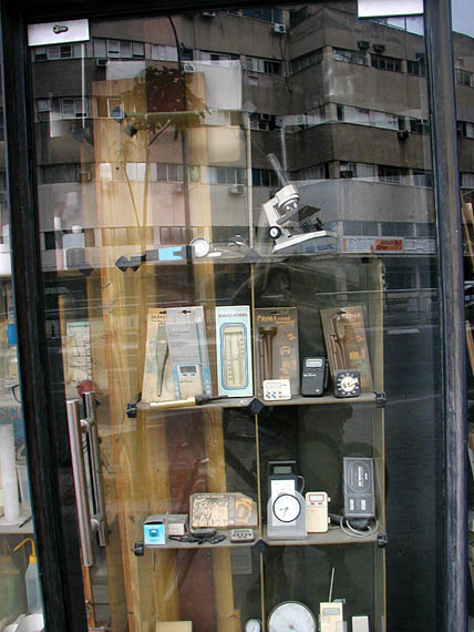 Магазин хим-товаров на Менахем Бегин. Чашечные весы, микроскоп, пробирки и старые секундомеры. Первая мысль: а где же оловянный котел для зелий (ну да, ГП перечитался..). А я в стекле отражаюсь.